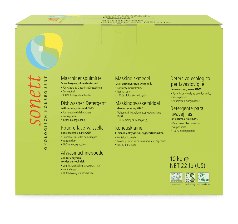 Sonett maskinoppvaskpulveret er fri for enzymer, fosfater og klorholdige blekemidler. Det inneholder kun biologisk nedbrytbare ingredienser som beskytter både oppvaskmaskinen og naturen. Den skånsomme, men effektive formelen sikrer en ren oppvask uten å etterlate skadelige rester.